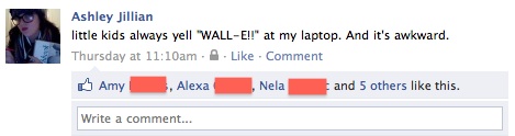 Accidental Joke Posted on August 28, 2011August 28, 2011 by ashleyjillian Posted in ComedyTagged Comedy, facebook, humor, joke, lol, oops, real life I am too embarrassed to clarify that this because I have a big Wall-E decal on my laptop and not because my laptop being an outdated piece of crap (with a lot of heart). Super bummed. Share this: Click to share on Facebook (Opens in new window) Facebook Click to share on X (Opens in new window) X Click to share on Tumblr (Opens in new window) Tumblr Click to email a link to a friend (Opens in new window) Email Click to print (Opens in new window) Print More Click to share on Reddit (Opens in new window) Reddit Click to share on LinkedIn (Opens in new window) LinkedIn Like Loading... Related