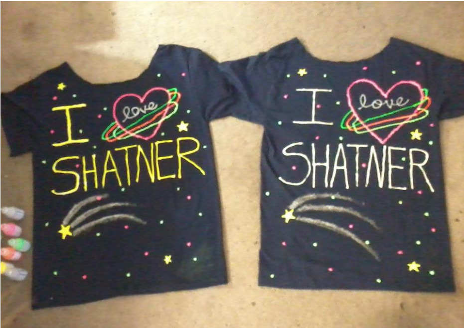 My best friend and I are wearing these to go see William Shatner tomorrow. She made them with her mad puff paint skills.  I am planning on zombi-fying mine for Halloween because I feel like the Shatner-Fangirl-Zombie is an underrated Halloween costume.  Also, I’ve been an Angler Fish for the past few years, so it’s probably time to change it up.